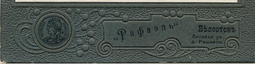 Najstarszą prezentowaną fotografię naklejono na winietę firmową zakładu w Rydze z ul. Młynowej, ale ostemplowano ją z obu stron owalną pieczątką z rosyjskojęzycznym napisem zawierającym w środkowym polu nazwiska wspólników, w otoku zaś informację adresową: Fotoatelier / Białystok ul. Mikołajewska.