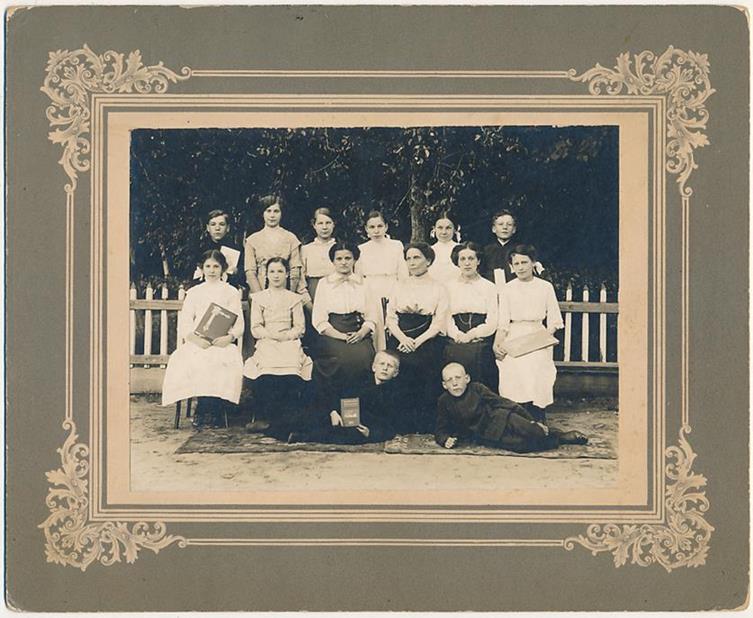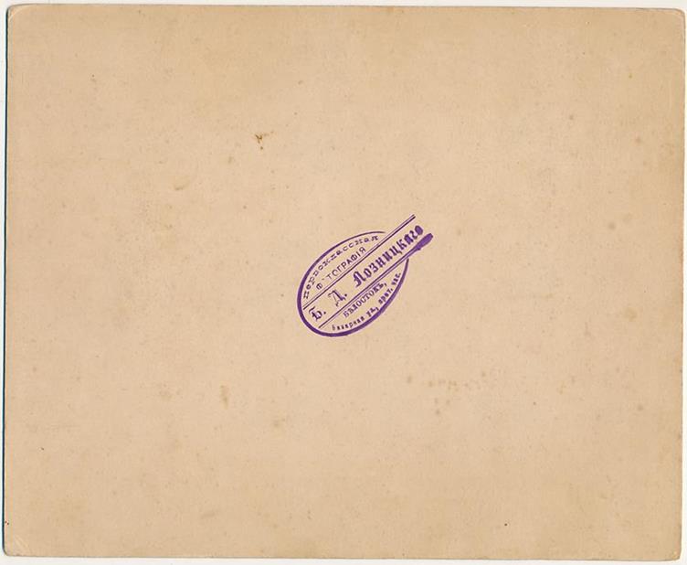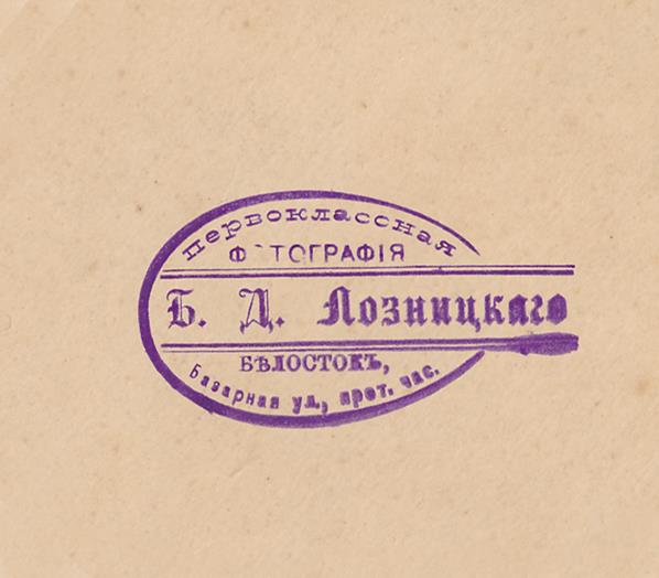 Fotografia I. Rendel Białystok wykonana w latach 1906 – 1911. Rzadki format pół gabinetowy o wym. 8 x 16 cm , połowa formatu Carte de Cabinet, litografia J. Pokorny Libawa. Napis na odwrocie: Artystyczne Studio Fotograficzne. Fotografia I. Rendela Białystok, negatywy są przechowywane. Oraz odręczny napis: Waria żona kuczerota.